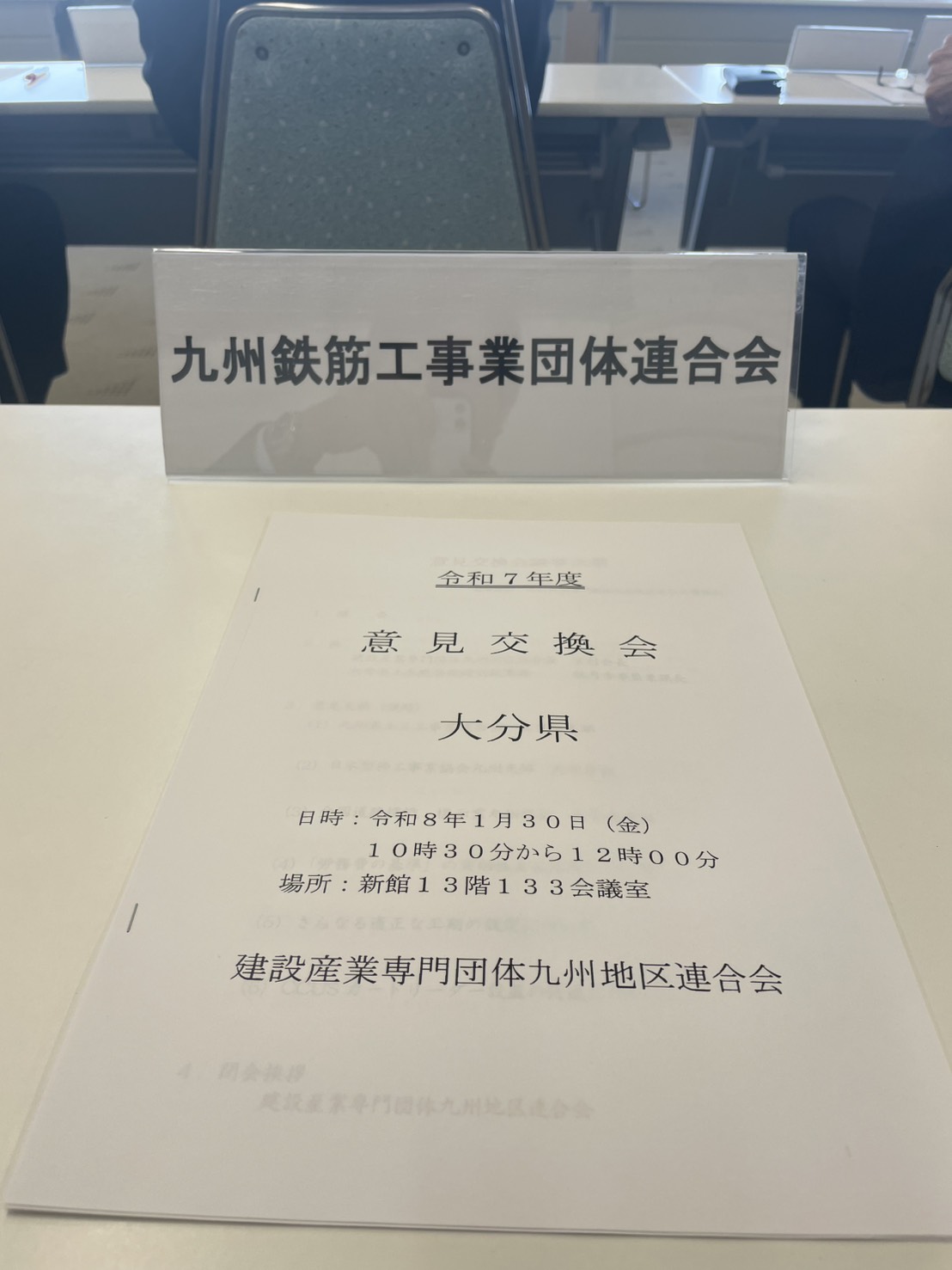 2026.01.31 大分県意見交換会に出席しました 先日、大分県意見交換会に出席いたしました。 本会は、大分県に対してさまざまな要望や意見を交わす場として開催され、九州鉄筋工事業団体連合会の一員として参加させていただきました。 現場の声や業界が抱える課題について意見交換を行い、地域の発展を支えていくことの重要性を改めて感じる機会となりました。 今後もこのような場を通じて、地域に根ざした建設業の発展に貢献してまいります。 SHARE POST 前へ 一覧へ戻る